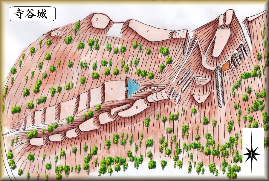 このように寺谷城は、山稜部分を削平した郭群と、それらによって囲まれた谷戸部とによって構成された城郭である。