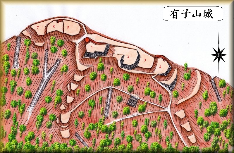 今回は有子山城には登れなかったが、『16世紀末全国城郭縄張図集成』(下)所収の図を基にしてラフを描いておく。登る機会があったら、もっとちゃんとしたものに描き直してみたい。