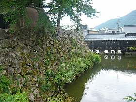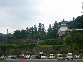 | 西側の市営駐車場から本丸西櫓を見たところ。昭和43年頃に木造で復元されたものらしい。 | 駐車場から辰鼓楼へ向かう途中の家老屋敷そばにあった石垣。これも三の丸城塁の跡であろう。西門あたりか。 |