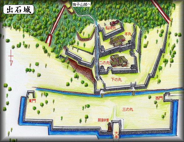 | 出石城(有子城)はもともとは山名氏の城であった。天正8年(1580)、羽柴秀吉による但馬征圧によって、出石城も落とされてしまった。その後は羽柴方の城となり、木下昌利、青木勘兵衛、羽柴秀長、前野長康らが在城し、城そのものはあいかわらず使用され続けていた。前野氏の後は小出秀政が城主となった。 小出氏は関ヶ原では親子で両軍に分かれることになった。それぞれに身を置くことによってどちらに転んでも家名を存続させようと考えたのであろう。当時出石城主となっていた吉政(秀政の子)は、西軍に加担した。 一方岸和田城主となっていた秀政と、次男の吉英は東軍に加担する。結果、東軍が勝利したわけだが、東軍に属した秀家の活躍と存命嘆願もあり、吉政は所領没収を免れた。 しかし、数年後、父の秀政が岸和田で没すると、どういうわけか、吉政は岸和田城主となり、出石6万石は吉英の領主となる。 慶長9年(1604)、出石5万石の領主となった小出吉英が出石城を本格的な近世城郭として改修した。小出氏の治世は9代続いた。小出氏の後は、松平氏、仙石氏と続いて、明治維新に至る。 この仙石氏の時に、仙石騒動とよばれるお家騒動が起こったことはわりと有名である。 |