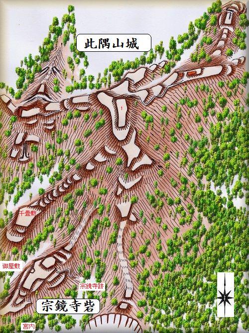 此隅山城にはまだ訪れていないが、山名氏城跡保存会のページに記載されている図面を見ていたら、むらむらと描きたくなってしまったので、鳥瞰図を描いてみた。詳細はまた訪問した際に改訂したいと思う。