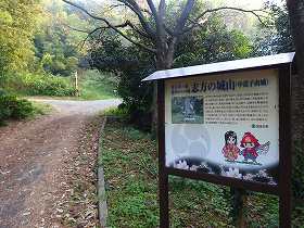 | 南側から見る中道子山城。一番奥の高いところが主郭。ここからの比高は220mほどある。 | 駐車場脇にある案内板。ここから車道を延々と歩いていく。 |