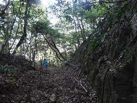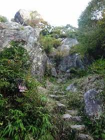 そんなわけで「なんで車道を延々歩かなければならないんだよ〜」とこぼしながら歩いていく。登城道とは言え車道だけに傾斜はそれほど急ではなく歩きやすい。ただし、時間がかかる。この車道を歩いていく途中に毘沙門岩があり、そこから旧登城道との分岐点があった。旧登城道は急峻なようだったので、登りは現在の登城道を利用し、帰りに旧登城道を通ってみることにした。ちなみに最短の「鎖場コース」というのもあったが、こちらは通っていないので、どれほど危険なのかは不明である。