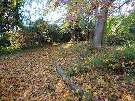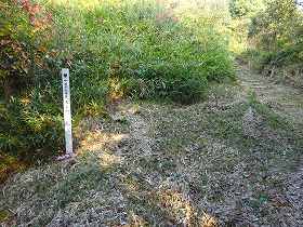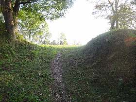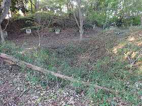 | その先の堀切。油を塗った笹の葉を置いていて、逆に羽柴勢に火を付けられたという伝承のある部分である。 | さらに先にある大堀切。 |