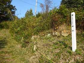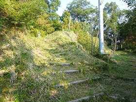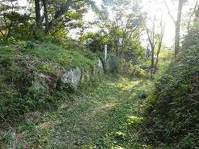 | そこから比高80mほど登っていくと大手門跡のところに出る。 | その先の登城道の脇にある櫓台。 |