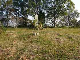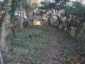 2郭は城内で最大の郭であり、長軸100m以上もある。そして中央部には大きな土壇がある。図の2の上と書いてある部分である。ここは物見櫓でも建てられていた場所なのであろうか。近代には神社が建てられていたようで、現在建物は残っていないのだが、参道や灯篭、周辺の石畳の道などが残されている。