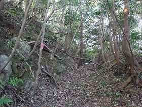 旧登城道とはここで合流する。かつてここに城門があり、これに押し寄せる敵は3郭の城塁から攻撃を受けるようになっていた。また、大手の南側の郭も、武者溜りのようなもので、大手を守備するための兵を置いていたところであったろう。ちなみにこの郭の先の斜面は木がきれいに切り払われていて非常に眺望がよくなっていた。どうも、ここはパラグライダーの出発地点であるらしく、そのために木がきれいに切り払われているようである。