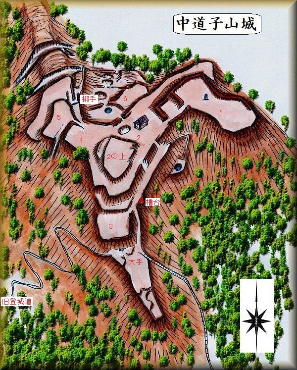 | 中道子山城とはまた変わった名称であるが、これはかつて弘法大師の弟子真然僧都が、この山に中道寺という寺院を建立したことにちなんだものであるという。となると、本来この城の名称は中道寺山城なのではないかと突っ込みたくなるところなのであるが、どうしたわけか現在は中道子山城と呼ばれている。 南北朝時代、赤松則村の4男であった氏則が志方の地を賜り、その拠点として中道寺のあるところに城を築くことになった。それが中道子山城である。 応安2年(1369)、赤松氏則は、摂津で反乱を起こし、兄の則祐や従妹の光範らに追討され、天王寺で一族と共に討ち死にした。これによって中道子山城も、城主を失うこととなった。 その後、孝橋繁広が中道子山城の城主として文献に現れてくる。孝橋氏は赤松氏の一族であり、嘉吉の乱で赤松本家が滅んでしまった後も、赤松家再興のために尽力した人物である。その後戦国期に至るまで、孝橋氏が中道子山城の城主として続いていった。 天文7年(1538年)、尼子氏が播磨に攻め寄せてきた際には、孝橋氏は櫛橋氏と共に英賀城で尼子勢を迎え撃ったが、敗れてしまい、中道子山城に逃げ帰ったという。 天正年間、中道子城は、羽柴秀吉の軍勢に攻められて落城したという伝説を有している。城側は堀切の側面部に油を塗ったタケノコの皮を敷き詰めて、攻城側の足を停めようとした。ところが、これに火を付けられてしまい、かえって落城を速めてしまったという。 |