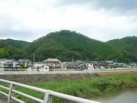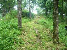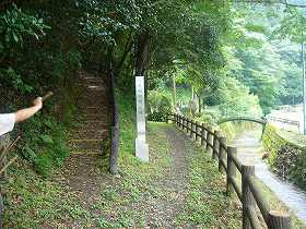 | 佐用川の北側から見た上月城。比高100mほどの山城である。 | 上月城址への登り口。道はけっこう整備されていて夏でも大丈夫である。 |