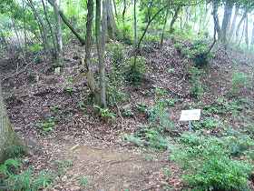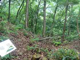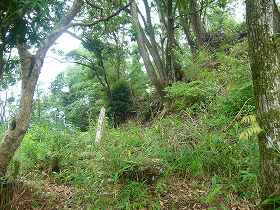 | 1郭の下の段の城塁。手前は堀切となっている。 | これがその堀切であるが、規模はとても小さい。 |
