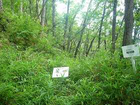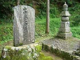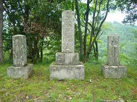 | 3郭南側に降りていく途中にある堀切。 | 山麓にはたくさんの碑が建てられている。これは「山中鹿之介」の戦功を称えるものである。 |