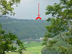 | 2郭から、1郭方向を見たところ。 | 2郭からははるかに利神城の山頂部分を遠望することができた。往時は狼煙で連絡を取り合っていたのであろうか。 |