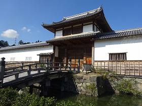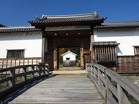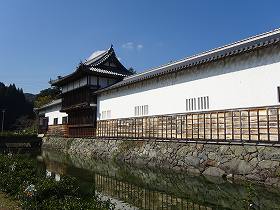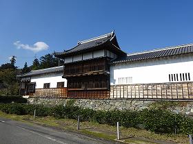 この正面部分は実に立派である。このうち、2層の物見櫓は現存建造物であり、明治以降学校として払い下げられ、2度にわたって移築されていたものを、現地に移転し復元修理したものである。これに続く多聞櫓や大手門、通用門などは、発掘調査の結果や古図を基にして再現されたものである。下方は石垣が築かれており、手前には水堀もある。堂々とした城郭構えである。