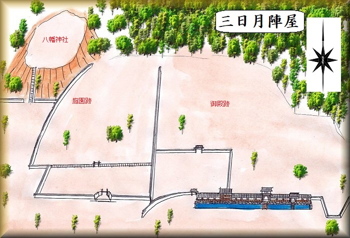 三日月陣屋はJR姫新線三日月駅の北西600mほどのところにある。八幡神社のすぐ東側下である。乃井野というところにあるので乃井野陣屋とも呼ばれている。三日月はかなり山中の奥まったところにあるのだが、この一帯はちょっとした集落になっており、昔からそこそこの人口が生活を営んでいたのであろう。