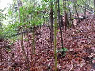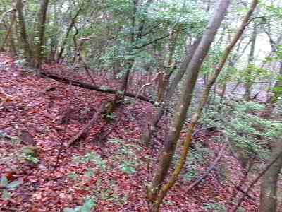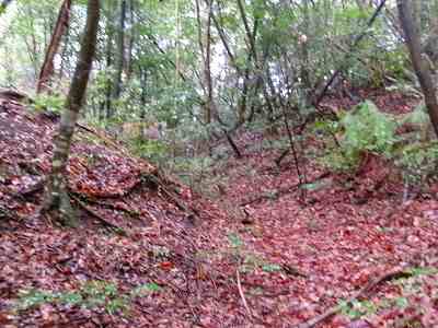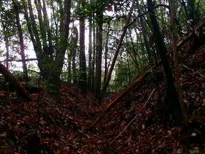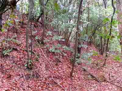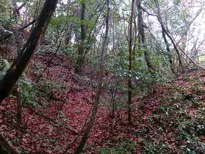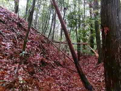 注意深く見ると、切岸の下は横堀状になっているのだが、ヤブがひどいので、注意してみないと気が付かないであろう。