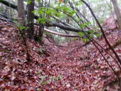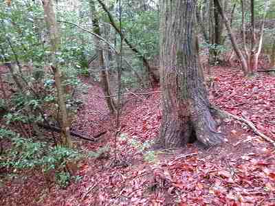 そうすると、やがて低い切岸が見えてくる。これが2郭の城塁であるが、切岸の高さは3mほどしかなく、それほど堅固な印象ではない。