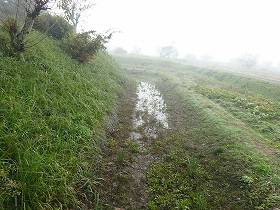 というわけで、近くまで行けばすぐに分かるだろうと思っていたのだが、この日、雲海がかなり濃厚になっていて、近くまで行ってもどこにあるのかよく分からなかった。そんなわけで集落をしばらく走り回ってようやく場所を見つけることができたのであった。しかし、霧さえ出て居なければ、遠くからでも南側の土塁はよく見えるに違いない。