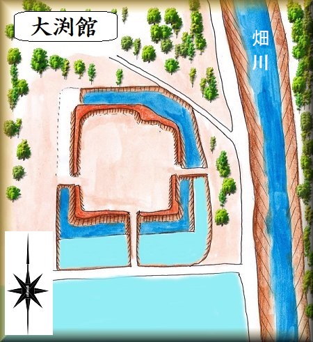大渕館は善法寺の北東400mほどの位置にあり、航空写真をみると、その形状をはっきりと把握することができる。畑川のすぐ脇で、水田地帯の奥にある。現在、内部は民家の敷地となっているため見学できないのだが、南側には実に立派な水堀や土塁が現在も良好に残されており、県指定の史跡となっている。