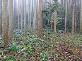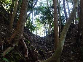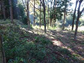 | 上の尾根にある中の壇から主膳丸まで落ちている巨大竪堀。 | 尾根に登っていくと、まず鴻の巣と呼ばれる平場がある。 |