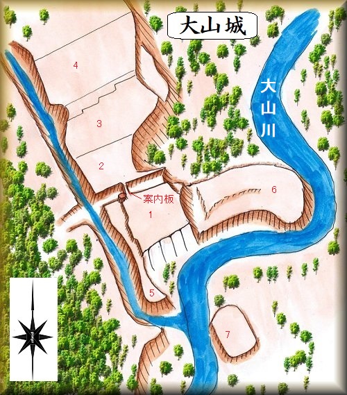 大山城は、大山川に臨む比高10mほどの台地縁部を利用して築かれていた。愛宕神社の北西200mほどの位置であり、道路脇に案内板が設置されている。ここまでくれば案内板が目に入り、背後に堀跡があるのが確認できるのであるが、ここ場所に来るのがちょっと分かりにくい。県道77号線のこの位置から民家の脇を抜けて奥の方に入り込んでいけば、やがて、城址案内板が目に入ってくると思われる。