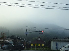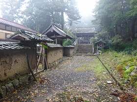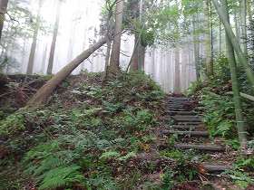 北側山麓の春日神社に登り口があるらしいので、それを目指していく。それにしても霧がひどい。天気予報ではすでに晴れていなければならないはずなのに、今にも雨が降り出しそうな霧の中で、まさに「きりがない」状態。なんでこんなに霧があるの?と思ってしまったのだが、後で山に登ってみると、次第に霧は薄くなり青空が見えてきた。さらに上に登ると、下の方に雲海が見えてきた・・・・つまり霧だと思っていたのは、いわゆる雲海だったのである。山城部分は雲海から浮かんでいるように見えた。こういうのはこの地域に特徴的な気候のようで、雲海は竹田城だけの専売特許ではないというのがよく理解できたのであった。