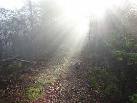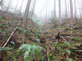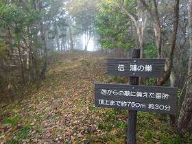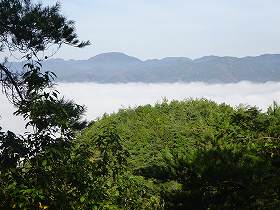 | 西蔵丸跡。 | 最後は西蔵丸の堀切の所から遊歩道を降りて行った。降りた頃、やっと雲海が晴れ、山頂部が見えるようになっていた。 |