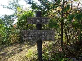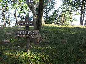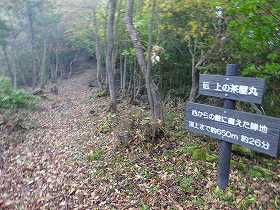 | 尾根はさらに続き「馬駆場」の案内表示がある。その側面部には何カ所かに竪堀が掘られている。 | 芥丸跡。 |