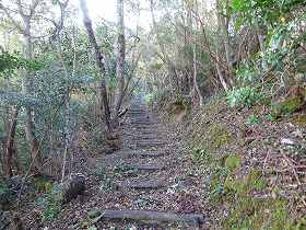 主膳屋敷内部を右手に進んでいくと、上に登っていく整備された階段が見えてくる。後はこれを登っていけば城の主要部に到達できるようになっている。主要部までは比高200mほどあるのだが、途中から曲輪が配置されているので、あまり飽きることなく登っていくことができる。