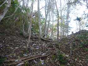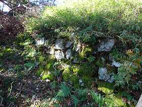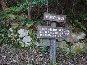 上の茶屋丸からはしばらく尾根沿いの階段を長く登っていく。するとやがて右手に堀切が見えてきた。城域を画するもので、ここから先が主要部の始まりである。その辺りから上の平場に回り込んでいったところが右衛門丸である。その入り口の脇には石垣が積まれていた。