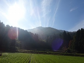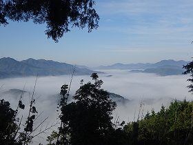 | 午前8時。天気予報は晴れのはずなのに、雲海のため、高城山がまったく見えない。しかし、上まで登れば、この雲海の上にでることができる。 | 登り口にある春日神社。かろうじて駐車スペースもある。 |
