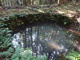 堀切から尾根の下の鞍部に降りてみる。そこには井戸があるらしいのでそれを目指す。すると井戸があった! かなり直径も大きく、石組みの井戸で、現在でも水を湛えている。天然の水源地なのか、あるいは周囲から水がたまるようになっているのか、いずれにしてもかなりの水量がありそうだ。どんな堅城でも水なしには籠城はかなわない。八上城は水源を有しているという点で、実際の長期の籠城戦に耐えうる山城であると言っていい。