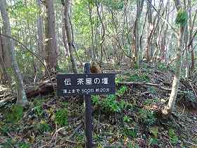 | そこから東側の尾根方向に降っていくと、はりつけの松跡の案内板が立てられていた。 | その先の茶屋の壇と呼ばれる平場。 |