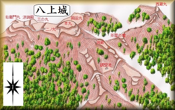 | 八上城は、丹波の国人領主であった八上氏の居城であるが、何といっても有名なのが、天正3年からの、明智軍との攻防戦であろう。 当主の波多野秀治は、当初は織田軍に味方していたのだが、織田信長に不信感を抱いたのか、赤井氏らと共に織田軍に反旗を翻して、明智軍と攻防戦を展開していくこととなる。 波多野氏は一度は明智軍を撃退することに成功するが、物量で押してくる織田勢力のために次第に押し込まれていき、天正6年12月からは八上城に押し込められ、籠城戦を強いられることとなる。 籠城の準備が十分でなかったのか、6か月後には城内で飢餓が始まり、『信長公記』によれば、城兵たちは草木を食べ、牛馬を殺して食べてしのいだというが、ついには抵抗する体力も失い、波多野3兄弟は捕らえられ、安土に連行されてそこで処刑されることとなった。八上城も明智軍の手に落ち、丹波は明智光秀が支配する処となった。八上城には並河丹波守が城代として入城したという。 天正10年、本能寺の変の後の山崎合戦で明智氏が滅亡すると、丹波は羽柴秀吉の養子秀勝が支配することとなり、八上城には浅野和泉守・余江長兵衛らが城代として入城した。 さらに羽柴秀勝の転封後は、前田玄以が城主となり関ケ原合戦を迎えた。 前田玄以の死後、前田主膳正茂勝が城主となるが、山麓の主膳丸はこの人物にちなんだ名称である。どういう経緯か分からないが、慶長13年、この主膳正茂勝は、重臣を殺害して出奔するという事件を起こし改易となる。その後には、常陸笠間城主であった松平康重が転入してくる。 慶長14年、幕府の命により、篠山城が天下普請として築城される。これにより篠山地区の政治の中心は篠山城へと移り、必要性を失った八上城は廃城となる。 |