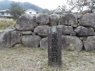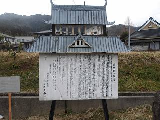 国道372号線(デカンショ街道)を通って行くと、道路の南側に、石垣造りの櫓台と、城の形をした案内板とが見えてくる。