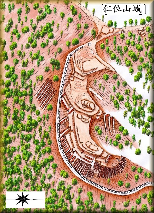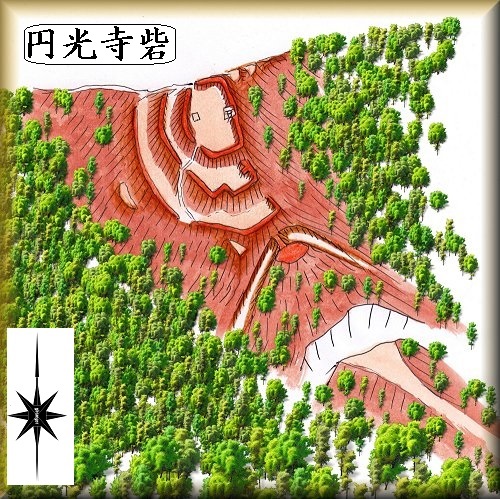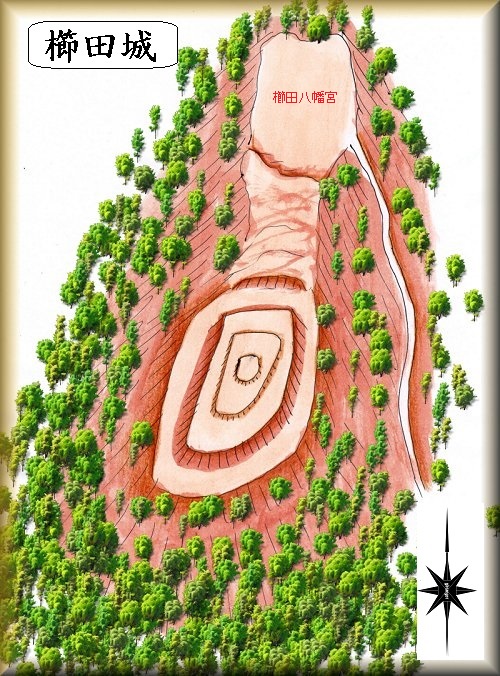 また、この山から南方三〇mほどの高所に別の峰があり、頂上に南北一七m、 東西二〇mの本丸跡がある。