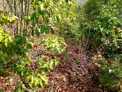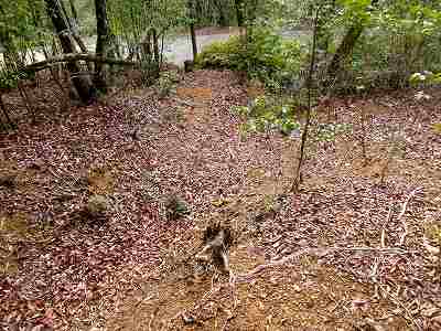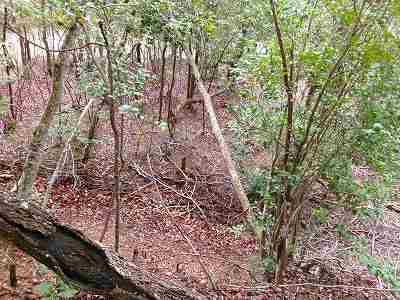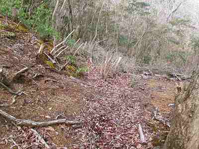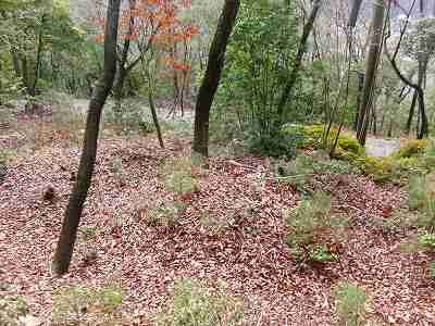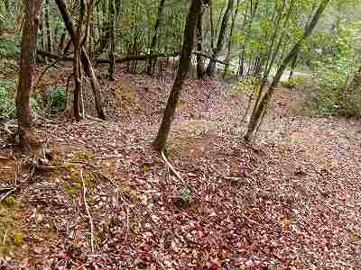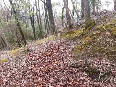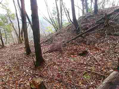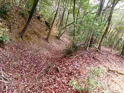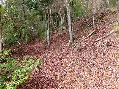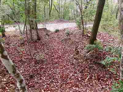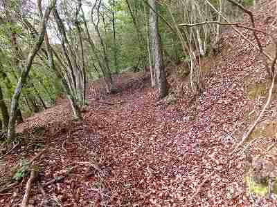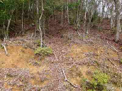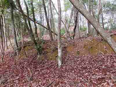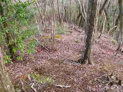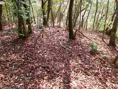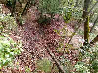 荒神社近くの谷状の凹地は仕切堀の跡のようで、 東の斜面には、当時の面影はほとんど残っていませんが、西側斜面には犬走りの跡と思われるところが みられます。