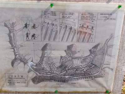 山頂の本 丸跡は一二m×二一mの平坦地で、ここに達するには北から三つの空堀を経て、 さらに八つの崖と郭跡を通過せねばならない。