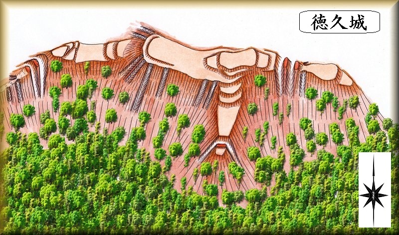 殿崎集落の東方にある標高三八〇mの峻険な山頂に徳久城がある。
