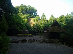 尾根を少し降っていくと、ちょっとした広場があり、ここに案内所、トイレ、城址碑、案内板などが建っていた。しかし、これもまだ城域内ではないらしく、ここから模擬の門をくぐって谷戸部に降りて、再び登っていった所が城址であるらしい。正面には城址北側のえぐられたような斜面が見えている。