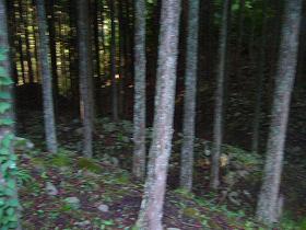 | 駐車場から歩いていくと、やがて案内小屋のある場所まで来る。ここから谷戸部に降りて再び上がった所が城址である。正面奥の崩落した崖が目だって見える。 | 谷戸に下る途中の左手には、妙に石がゴロゴロしている。自然に転がっているにしては数が多すぎて違和感を感じてしまう。この辺りにもかつては石垣があったのだろうか。 |