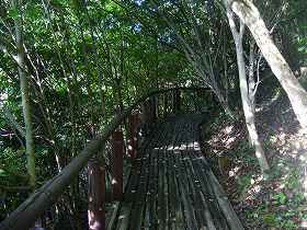 谷戸部から順路に従って進んでいくと、木の桟橋のようなものが、山裾を廻るようにして付けられている。こういう道よりも本来の山道の方が歩きやすいのだが、一応、遊歩道としてかつての波賀町が設置したものだろう。竹下内閣時代の「ふるさと創生事業」の1億円を使用して造られたものらしい。