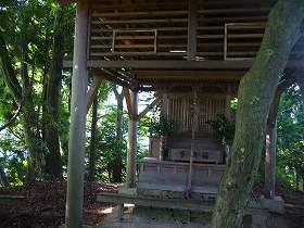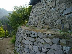 | 山頂の本丸と思しき所に祭られている神社。本丸といってもたいした広さはなく、削平も不十分な狭い郭である。 | 物見台下の石垣。段々に積まれているのは、高石垣を築くほどの技術がなかったということであろうか。 |