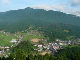 | 物見櫓下の石垣。どうみても積み方が新しい。復元石垣ということであるが、模擬のように見えてしまう。 | 物見台から見る波賀の町。高いだけあって、かなり眺望の良い場所である。 |