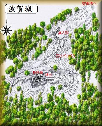 中国自動車道の山崎ICを降りて、国道29号線(因幡街道)をひたすら北上する。20kmほど車で走って波賀地区に来ると、国道429号線と合流する辺りの右手(東側)に、山上に建造物のあるとんがった山が見えてくる。これが波賀城である。比高200mほどの急峻な山である。