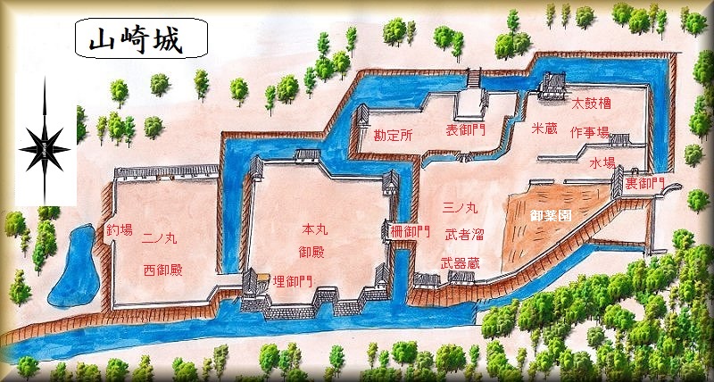 | 山崎城を築いたのは池田輝澄である。関ケ原合戦後、播磨52万石は池田輝政に与えられたのだが、輝政の死後の池田家は、岡山藩と鳥取藩とに分割された。このうち宍粟郡は、岡山藩池田忠継の所領となった。 忠継の死後、元和元年(1615)、宍粟郡3万6千石は、輝政の4男輝澄に分地されることとなった。こうして成立したのが山崎藩であり、これによって山崎城が築かれることとなった。 寛永8年(1631)、佐用郡2万5千石が加増され、山崎藩は合計6万5千石の大藩となった。 ところがその7年後の寛永15年、家臣同士の紛争が起こり、輝澄は家中不取り締まりのかどにより改易となってしまう。これが池田騒動である。輝澄は因幡国鹿野に堪忍分1万石をもらって蟄居することになる。後に輝澄の子の正直は福本1万石の大名として復活する。 池田氏改易の後、寛永17年(1640)、宍粟郡・佐用郡6万石は松井康映に与えられ、山崎城に入城した。 ところが9年後の慶安2年(1649)には、松井氏は石州浜田に転封となり、池田恒元が宍粟郡3万石で入部する。 この池田藩は3代続いたが、3代目の数馬が7歳という幼さで死去したため、嗣子なく断絶となる。 延宝7年(1679)、本多政貞が1万石で入部する、といった感じで、山崎城の城主はめまぐるしく変転するが、この後は本多氏が9代続いて明治維新を迎えることとなる。 本多氏は城主格として認められていなかったため、山崎城は陣屋として改修された。しかし、山崎城の本丸をそのまま用いているので、実質的には城のようなものだったのであろう。 |
