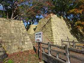 最も見どころがある遺構は、本丸の南側にあった埋御門の跡である。ここには現在も立派な石垣が残されている。あまりにも見事な切込みハギの石垣なので、一見、近代の作事のようにも見えてしまうのだが、きちんと折れながら門内を通過するような構造になっており、きちんとした遺構である。これに連続して折れのある石垣が東側に延びている。