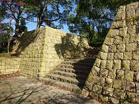 | 二ノ丸跡の文化会館の土手。石垣は遺構かどうかわからない。 | 本丸南側の梅御門の石垣。見事な切込みハギである。 |