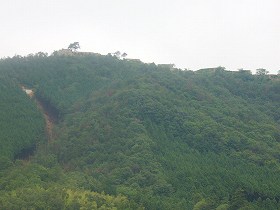 | 山麓から見た竹田城。山上の石垣がよく見える。 | 車でいけるところまで行ってみた。本城部分のすぐ真下である。 |