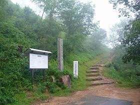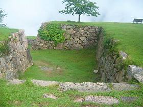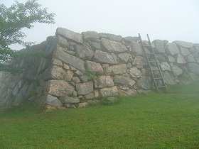 | 二の丸から天守台に向かって石垣が長く延びている。雨でレンズが曇ってしまって、うまく撮影できない。 | 天守台には石段はなく、梯子を伝って上るようになっている。 |