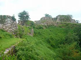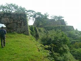 | 南千畳の高石垣。地勢も高い!比高250mもあるのである。 | 南千畳から本丸方向を見たところ。石垣が複雑な構造をしているのがわかる。 |